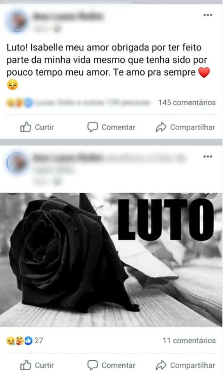 “Luto Isabelle meu amor obrigada por ter feito parte da minha vida mesmo que tenha sido por pouco tempo meu amor. Te amo pra sempre”, diz a postagem.