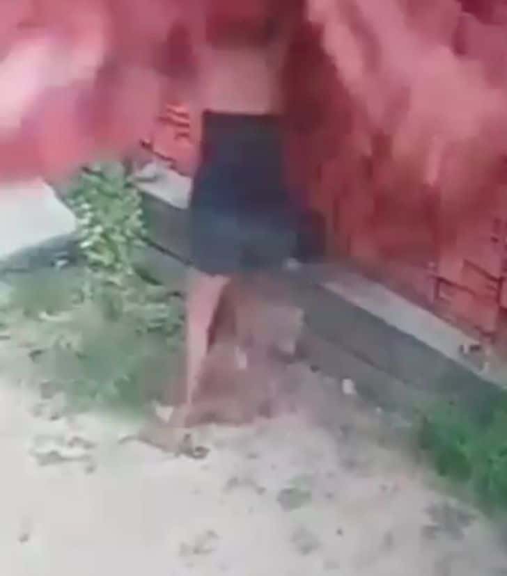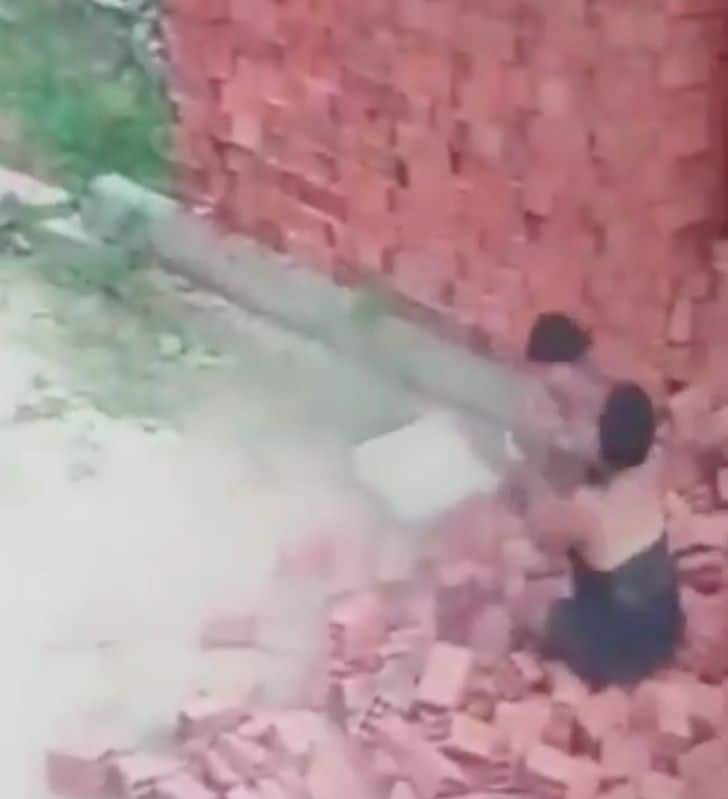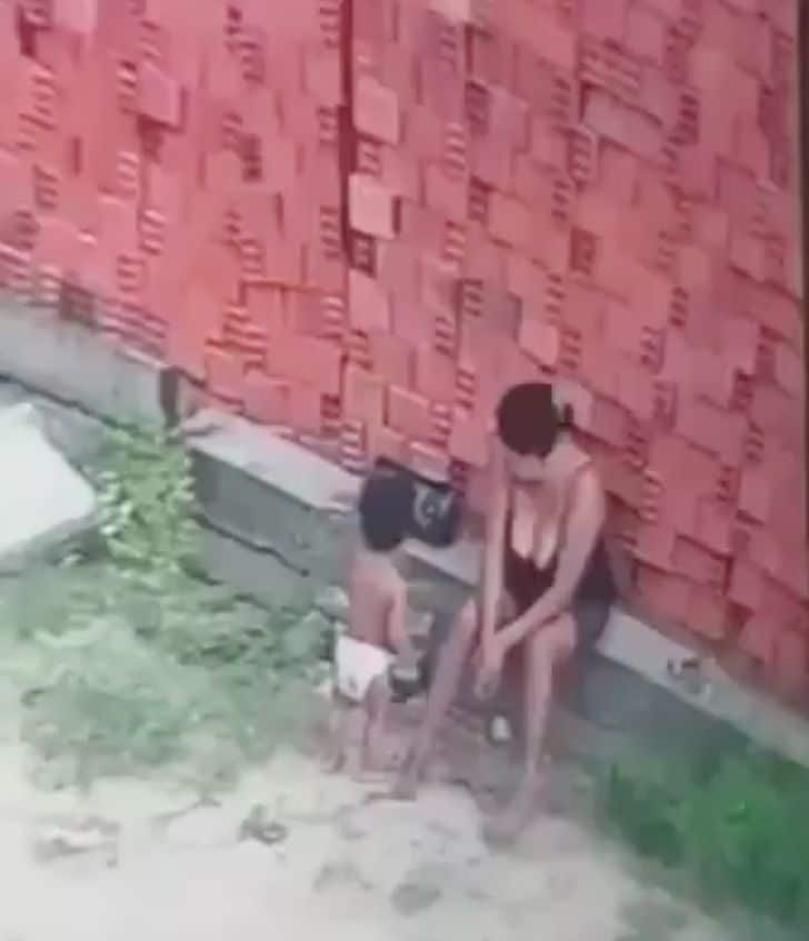 Junto com o menino, ela estava sentada na beira de uma parede. A certa altura, o menino aponta para a parede e a mulher, que não foi identificada até agora, percebeu que iria desabar.