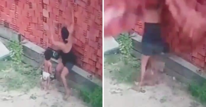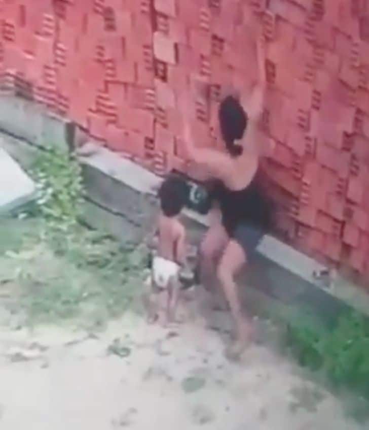 No vídeo compartilhado no Twitter pelo policial militar Gilson Cardoso Fahur, é possível ver a mulher usando seu corpo como escudo no momento em que uma parede de tijolos desaba sobre os dois.