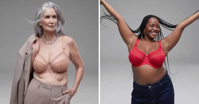 Além disso, a marca também incluiu uma mulher mais velha que tem cabelos completamente grisalhos, manchas senis e rugas. Outra coisa que chama a atenção é que a marca oferece sutiãs para todos os tamanhos, com uma variedade bem ampla.