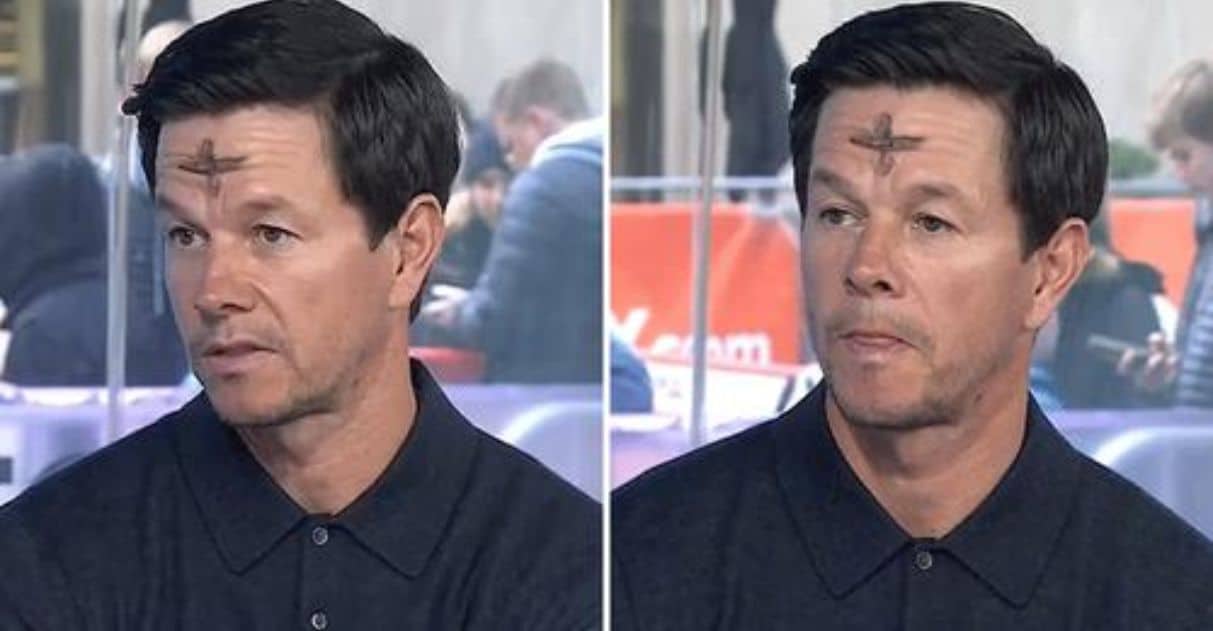 Wahlberg apareceu no programa com uma cruz negra na testa – os devotos cristãos recebem as cinzas do arrependimento na forma da cruz na quarta-feira de cinzas, um dia sagrado de oração e jejum.