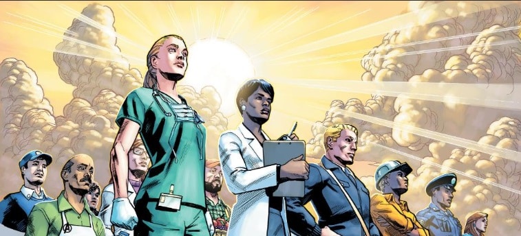 O desenho foi executado por Mike Hawthorne e colorido por Edgar Delgado. Mostra, entre outros profissionais, uma enfermeira, uma médica e um policial, tidos como essenciais em meio à pandemia do novo coronavírus.