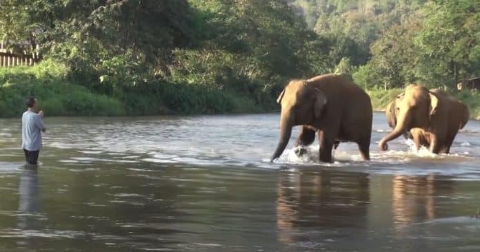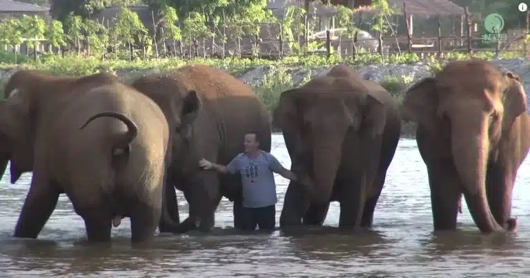 No vídeo disponibilizado pelo portal Reshare Worthy, os seis elefantes ouvem-no chamando-os rio abaixo e trombeteiam um alô em troca. Ouvir seus murmúrios felizes e vê-los cercá-lo é de aquecer o coração!