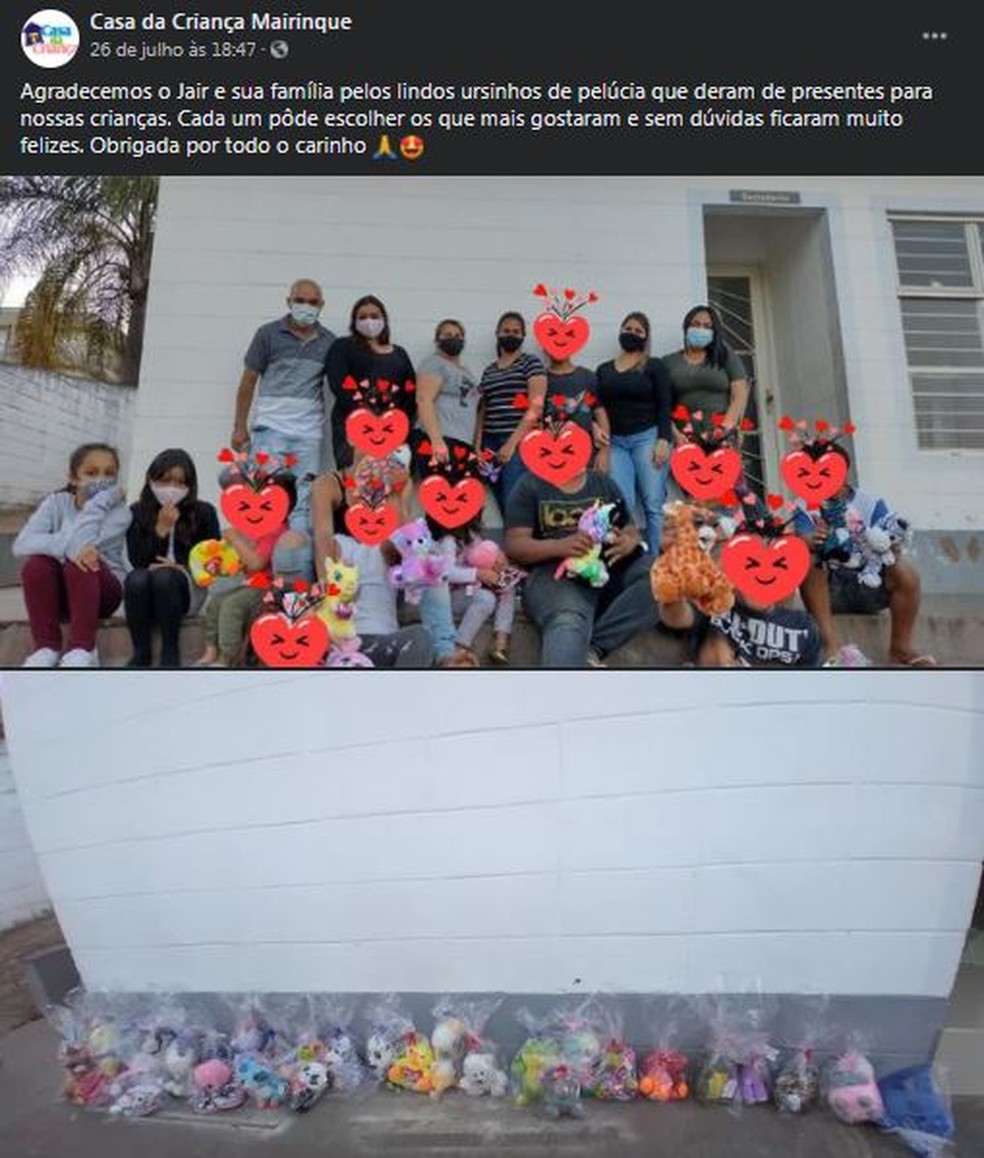 No último dia 26, doze crianças do ‘Lar da Criança de Mairinque’ receberam 32 ursos doados por Maria Clara. Apesar do valor alto, Jair ressalta o espírito de solidariedade da filha.