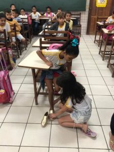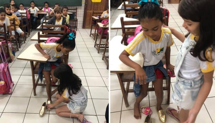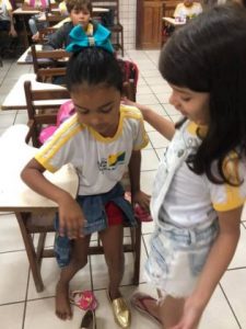 Logo uma aluna levantou a mão e disse que calçava o mesmo tamanho. Isabela então foi até ela, mostrou seu sapato e se ajoelhou. Foi aí que ela colocou o calçado no pé da coleguinha e ficou super contente em perceber que ele havia se encaixado perfeitamente.