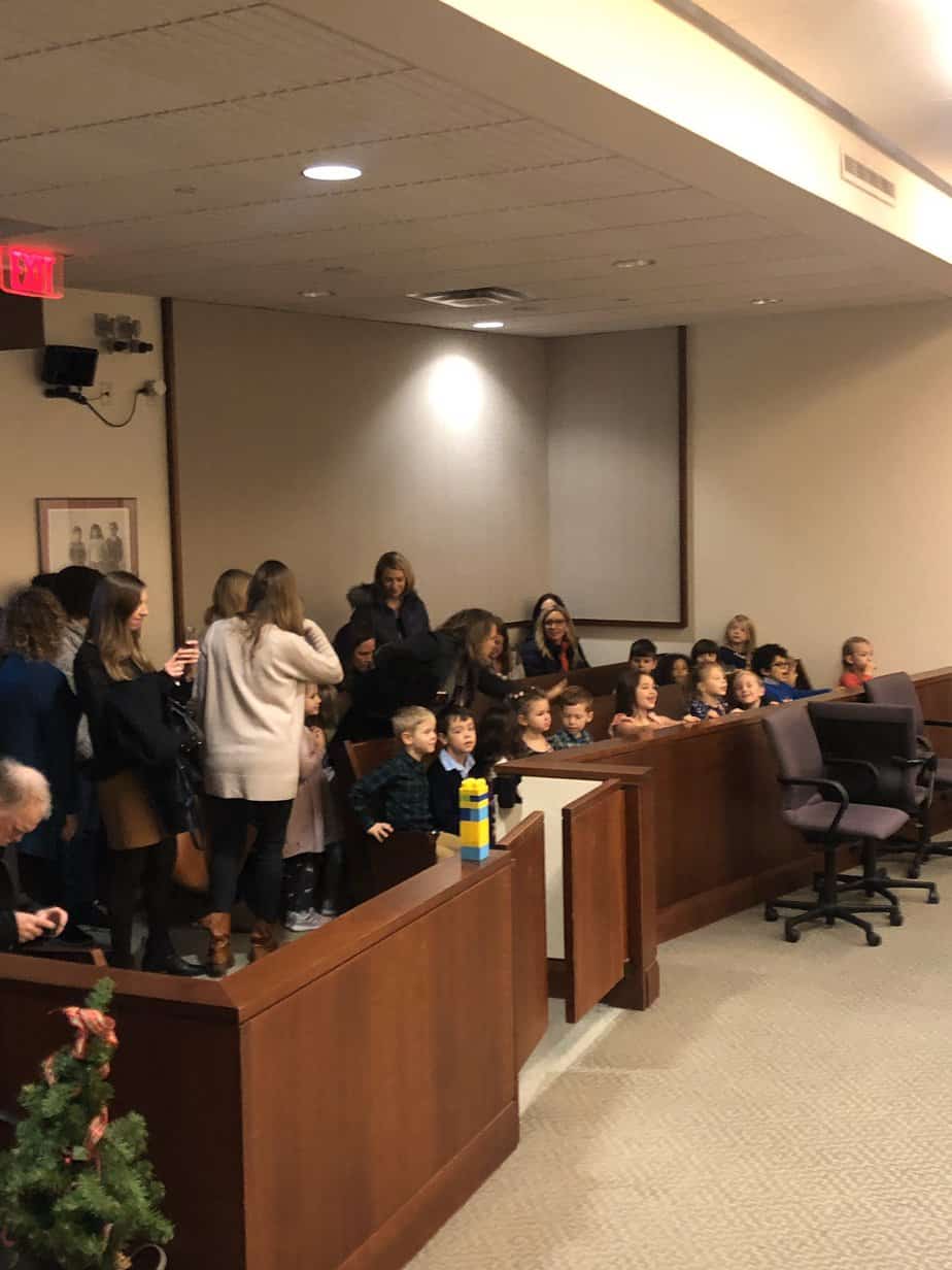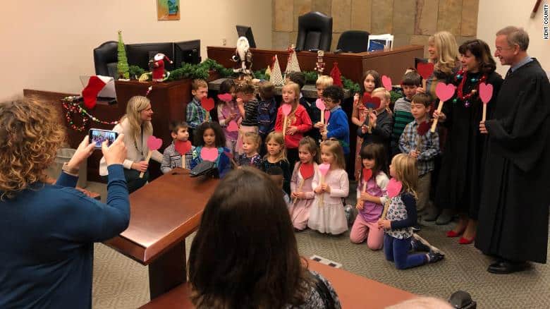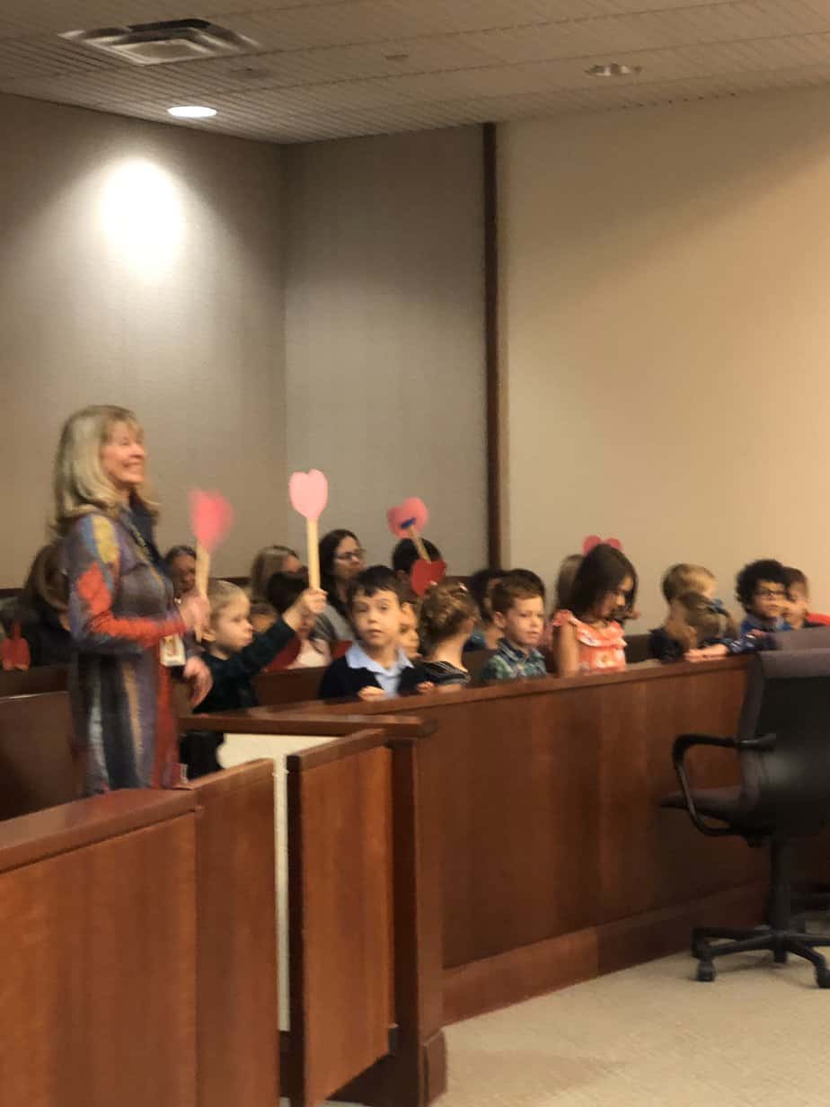 Uma criança adorável, Michael Clark Jr., de cinco anos, estava na audiência de adoção para formalizar sua união com sua nova família, e foi calorosamente apoiado por sua outra família escolhida – toda a sua turma do jardim de infância.