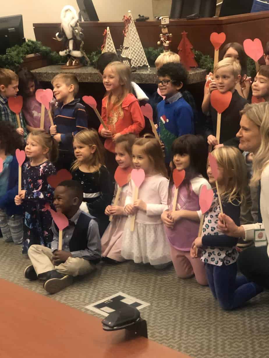Sentados com grandes recortes coloridos em forma de coração montados em varas de madeira em suas mãos, os colegas de classe de Michael acenaram com seus corações de papel e o aplaudiram enquanto o processo era finalizado para Michael se juntar à sua nova família.