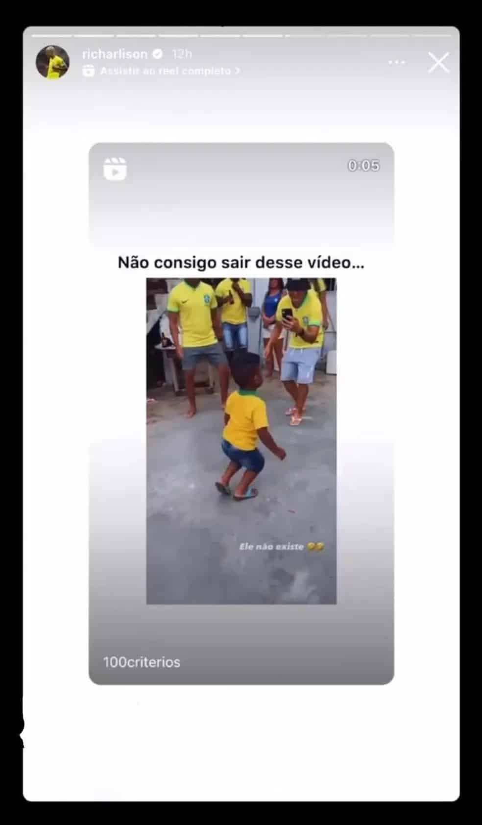 Nas imagens, Enzo veste a camisa amarela da seleção enquanto imita os movimentos que Richarlison faz nas comemorações de cada gol.