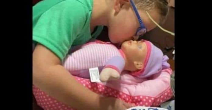 O mais velho “está super feliz com sua boneca, cuida dela, abraça-a e diz coisas boas para ela”, escreveu a mãe.