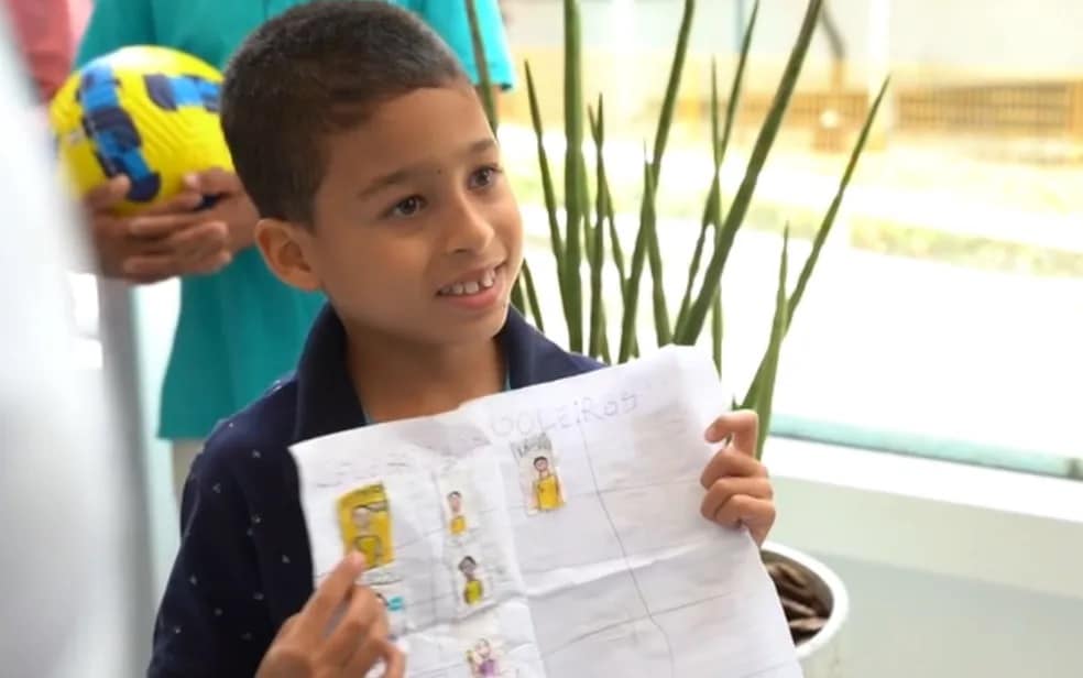 Sonho realizado! João Gabriel, menino que viralizou na internet após desenhar o próprio álbum da Copa do Mundo 2022 por não ter dinheiro para comprar as figurinhas, viajou pela primeira vez de avião para conhecer o técnico Tite e jogadora Marta, cinco vezes a melhor do mundo.