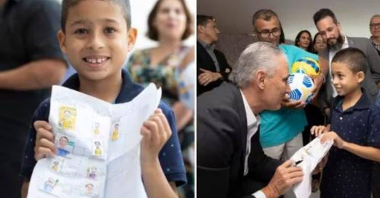 Sonho realizado! João Gabriel, menino que viralizou na internet após desenhar o próprio álbum da Copa do Mundo 2022 por não ter dinheiro para comprar as figurinhas, viajou pela primeira vez de avião para conhecer o técnico Tite e jogadora Marta, cinco vezes a melhor do mundo.