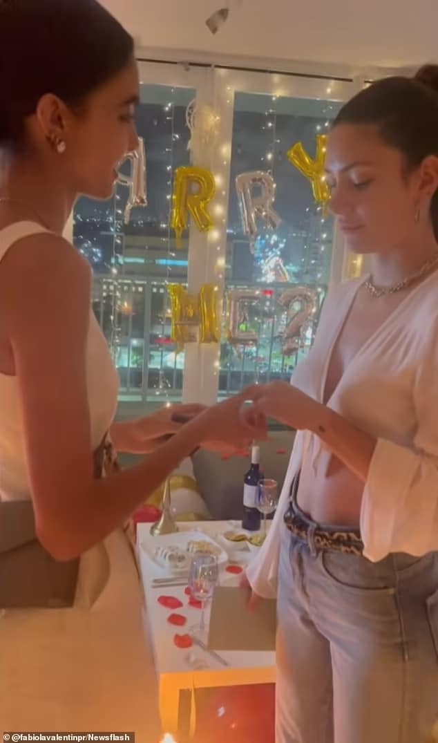 Balões dourados com os dizeres ‘Casar comigo?’ foram colocados na frente da janela antes que o vídeo salte para um clipe de Fabiola colocando um anel no dedo de Mariana.