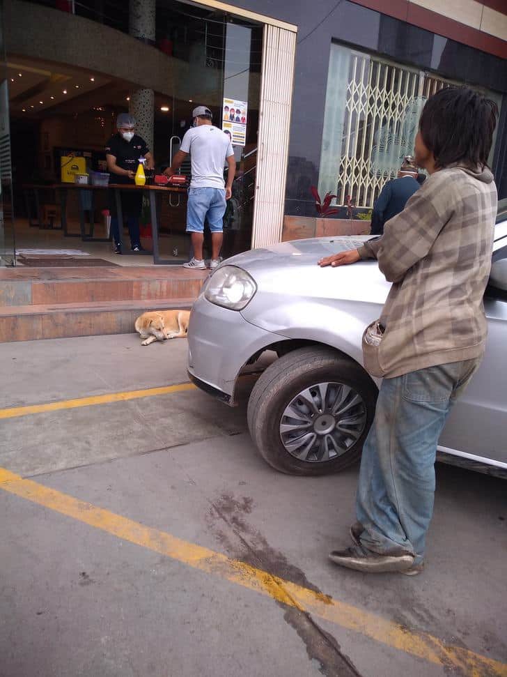 A mulher ficou satisfeita depois de comprar e entregar alimentos aos necessitados, a alegria imediatamente se desenhou em seu rosto. Mas o que mais a surpreendeu foi quando o homem foi até o lugar onde estava seu bichinho de estimação, sentou-se com ela e dividiu o frango entre eles .