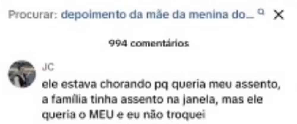 “Avisei que aquele lugar era meu, e a criança saiu. Mas depois insistiu em voltar porque queria sentar ao lado da avó, mesmo com várias outras janelas disponíveis na mesma fileira e atrás”, explicou Jennifer.
