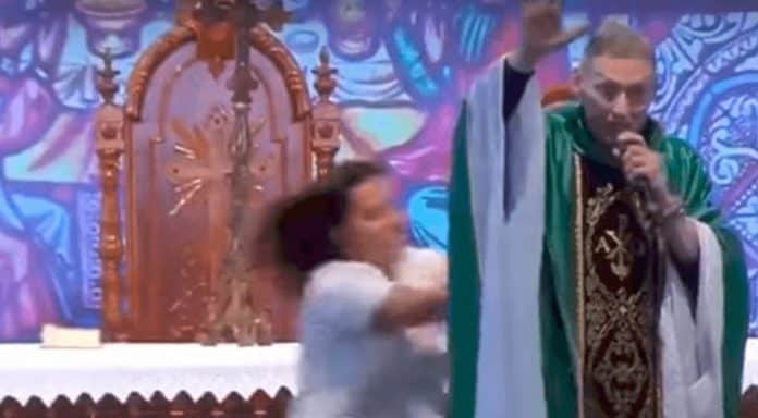 O padre estava no local para a missa de encerramento do acampamento ‘Por Hoje Não’ (PHN). Por volta das 14h50 a mulher, que participava do evento, conseguiu furar a segurança, invadiu o palco por trás e empurrou o padre, que caiu da estrutura.