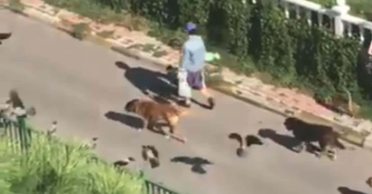 A cena chamou a atenção e não foi sem motivo. Imagina você olhar para a rua e ver uma senhora a ser seguida por dezenas de animais de espécies diferentes?