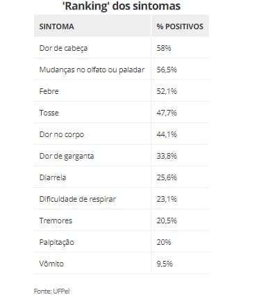 No topo dos sintomas estão a dor de cabeça, mudança no olfato ou paladar, febre, tosse e dor no corpo. Veja, logo abaixo, a tabela: