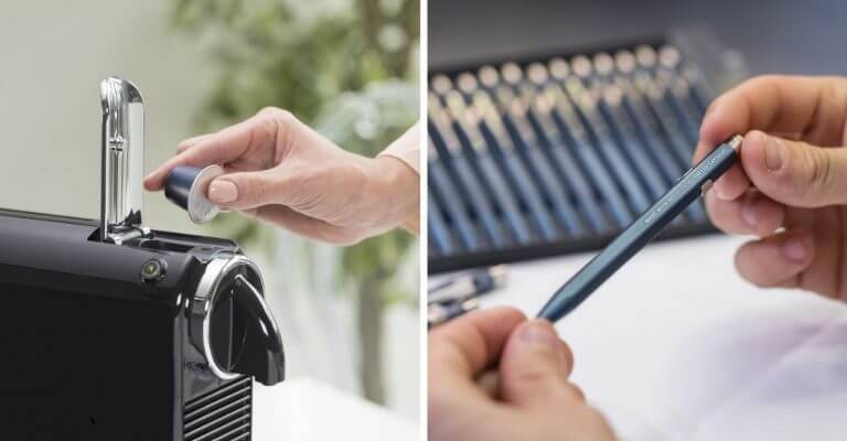 As empresas Nespresso e Caran d’Ache se uniram para um bonito projeto. Eles estão reciclando as embalagens de café e, como resultado, confeccionando belíssimas canetas. A caneta esferográfica premium é produzida a partir de cápsulas de alumínio recicladas.