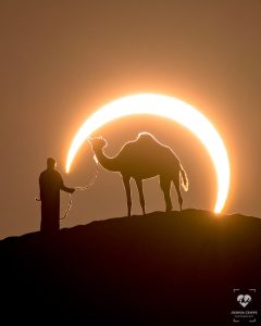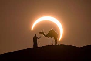 Utilizando o aplicativo PhotoPills, ele foi capaz de entender exatamente qual seria a melhor maneira de posicionar sua câmera. Então, bastaram algumas horas de paciência até que o alinhamento entre o sol e o homem com o dromedário fossem perfeitos.