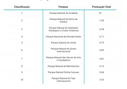 Esta classificação foi criada em outubro com base nos dados do Google Maps. Todos os parques naturais marcados como tal, foram tidos em conta. Os 10 primeiros foram elaborados com base no número de reviews no Google, a classificação e o volume de pesquisa. Com estes números e valores criou-se, então, uma classificação final dos melhores parques naturais em Portugal. Os empates foram resolvidos através da verificação na quantidade de comentários.
