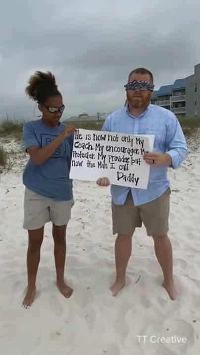 Finalmente, Alecia decidiu que era hora de oficializar as coisas no ano passado. E para deixar o momento mais especial, ela organizou uma proposta surpresa de adoção para o pai no aniversário dele.