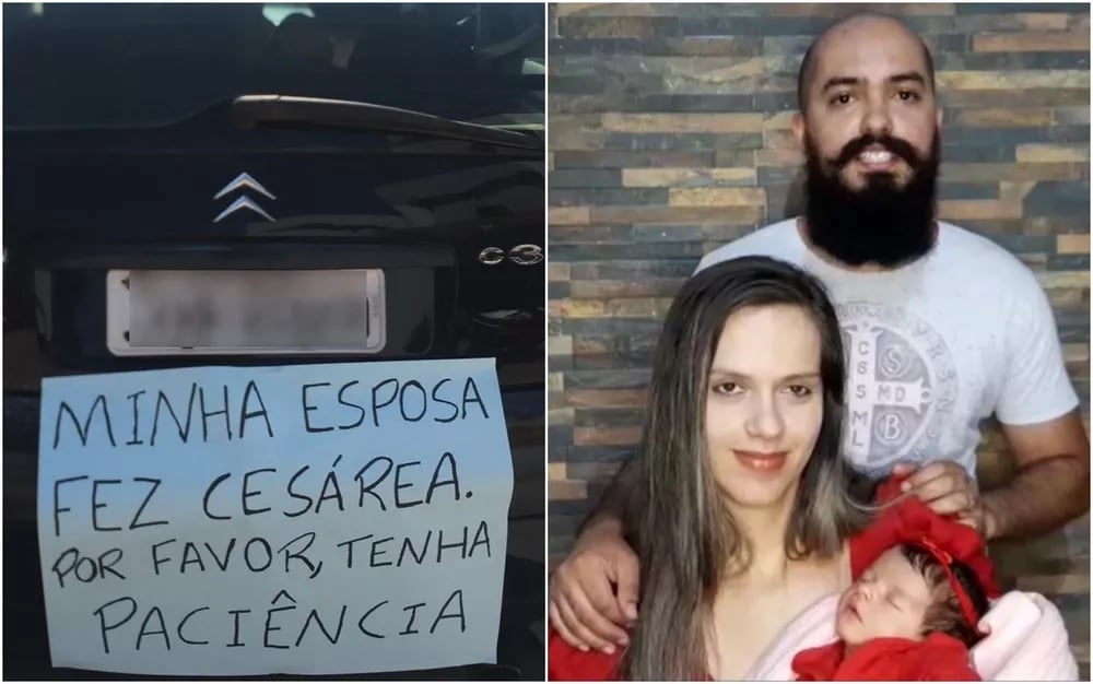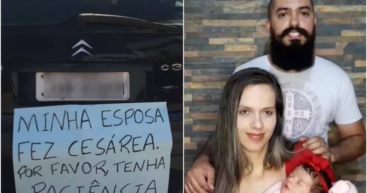 ‘Minha esposa fez cesárea. Por favor, tenha paciência’, diz o cartaz colado por Elder de Freitas Ribeiro.