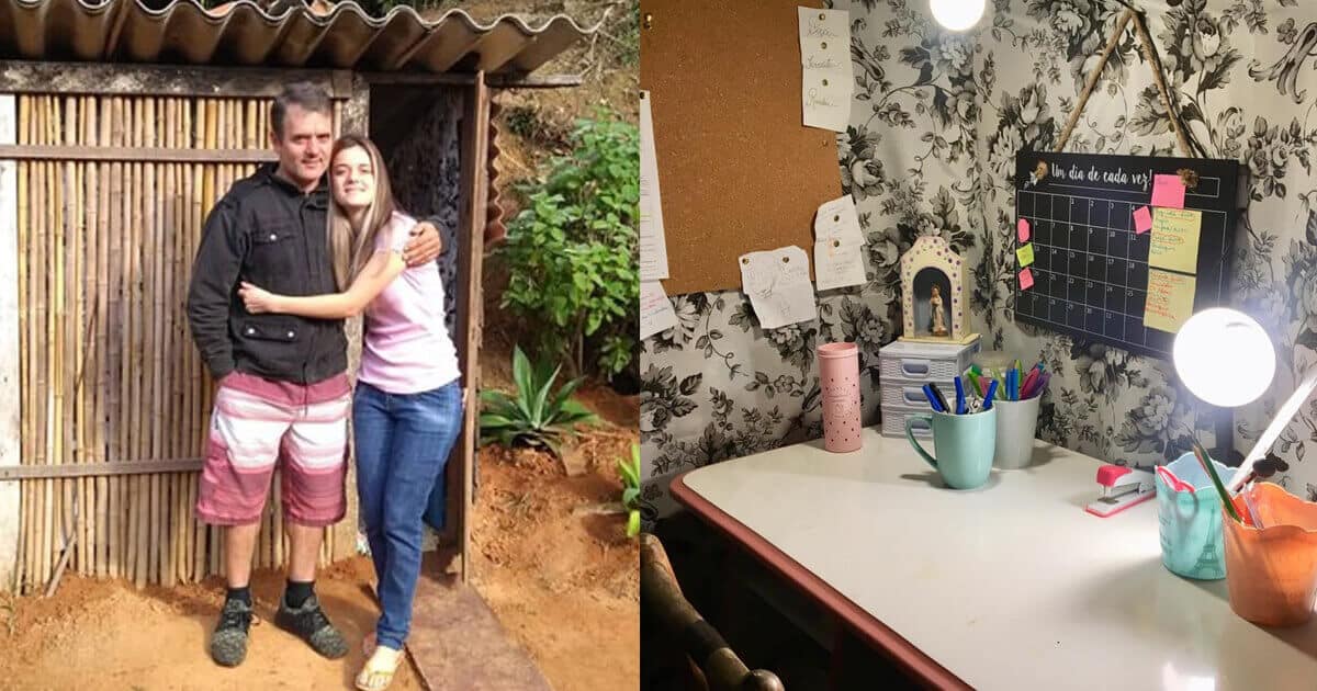 Gisele, que é bolsista do sétimo período de Direito, vinha enfrentando dificuldades para se concentrar nos estudos por falta de espaço e privacidade em casa. Ela tinha que se deslocar do quarto, que divide com dois irmãos; para a varanda, onde faz frio à noite e tem o barulho dos carros na rodovia; ou para a cozinha, onde ela precisava esperar todos irem dormir para estudar. Então, notando o esforço da filha frente às dificuldades, seu pai resolveu construir um quartinho de bambu no quintal.