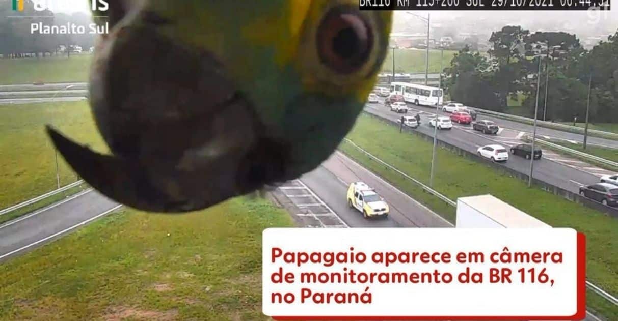 Um papagaio “deu as caras” – literalmente – em uma câmera de monitoramento da BR-116, em Curitiba, segundo registros da concessionária que administra o trecho