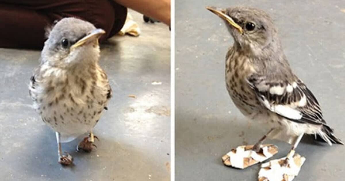 As pessoas encarregadas do caso resolveram o problema de maneira muito criativa. A equipe fez pequenos sapatos ortopédicos que ajudariam o pássaro a andar. Uma espécie de gesso improvisado para corrigir as patas do pássaro.