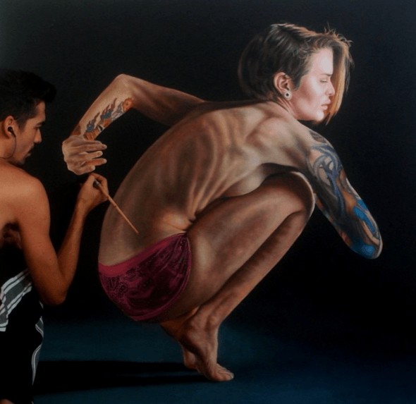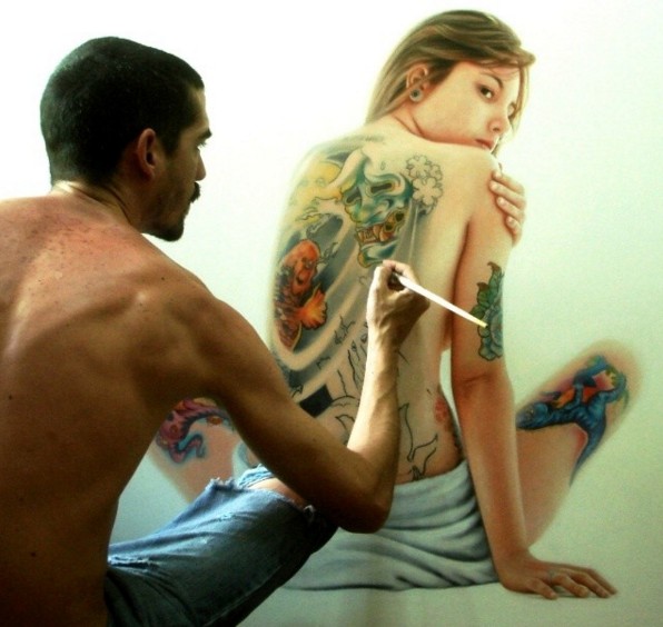 Após concluida a sua pintura, como se fosse uma composição ainda de seus quadros, ele posa ao lado deles, criando ilusões óticas extraordinárias..