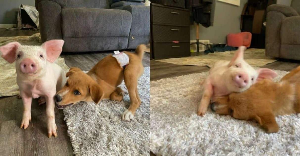 “Ele definitivamente a ajudou a se sentir mais confortável vindo aqui”, disse Edwards. “Ela ainda está em quarentena dos outros porcos (apenas protocolo – por segurança), então ela consegue um bom amigo desta forma e não está sozinha. E ele perdeu a hora de brincar da irmã, o cachorro … então, desta forma, ele ainda tem um amigo para brincar. Funciona para os dois! ”