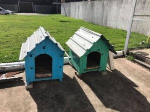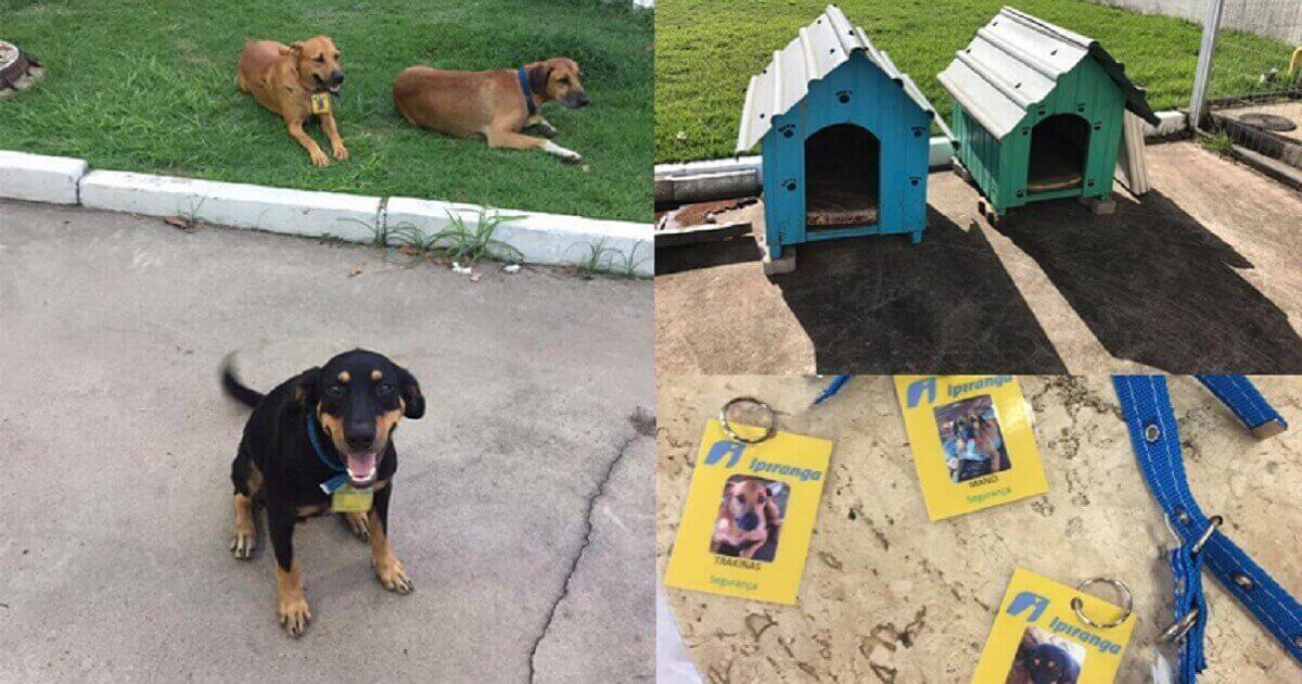 Os cães também ganharam uma casinha cada um e recebem ração e água todos os dias. A história foi contada pela Pati Nobre, uma moradora da cidade, e compartilhada pela página do Facebook Adote um vira-lata RS.
