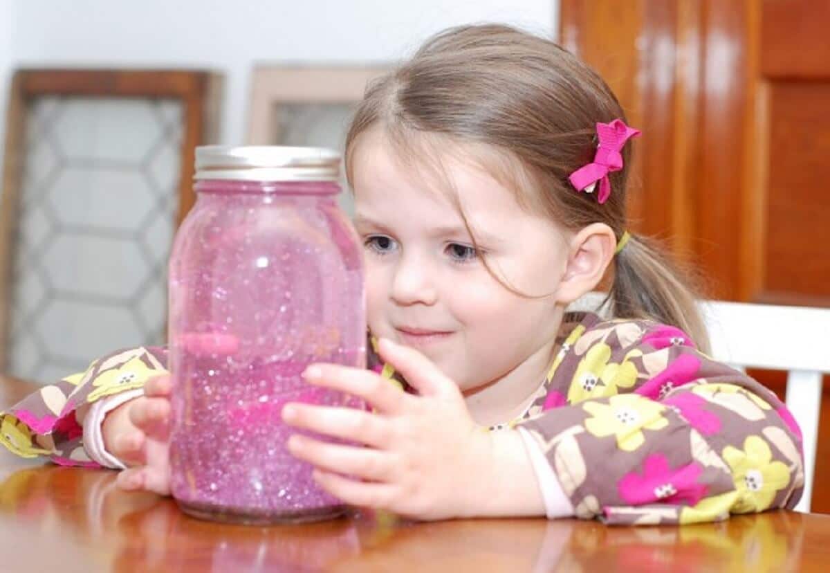 O pote da calma é um recipiente transparente, pode ser de vidro ou de plástico, dentro do qual se coloca glitter, água, cola e tinta. Melhor ainda é deixar a criança escolher a cor do glitter e permitir que ela mesma faça seu próprio pote da calma.