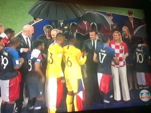 Os dois desceram juntos, de mãos dadas, ao gramado para participarem da entrega da premiação. Na cerimônia, sempre sorridente e emocionada, presenteou-nos com um seu sorriso, abraçando a todos os jogadores, tanto da Croácia quanto da França..