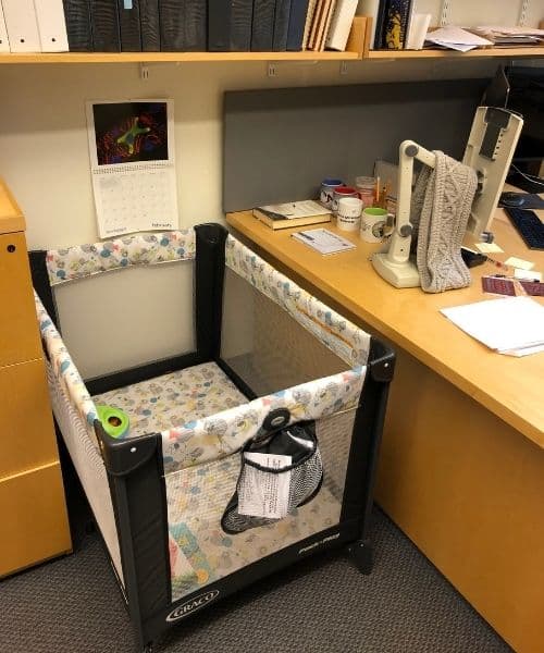 Troy Littleton, que dirige um laboratório de pesquisa na faculdade, colocou um berço no escritório de seu laboratório para ajudar uma de suas alunas de pós-graduação, Karen Cunningham, que tem uma filha de 9 meses chamada Katie.