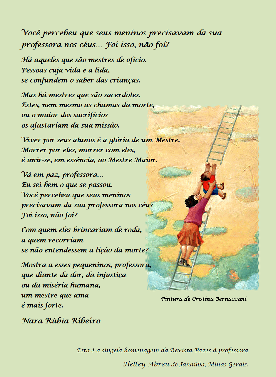 Esta é a singela homenagem da Revista Pazes à professora Helley Abreu. Ela faleceu ontem quando tentava salvar os seus alunos de um atentado no qual um senhor jogou combustível e ateou fogo em dezenas de crianças em uma creche, em Janaúba, Minas Gerais.