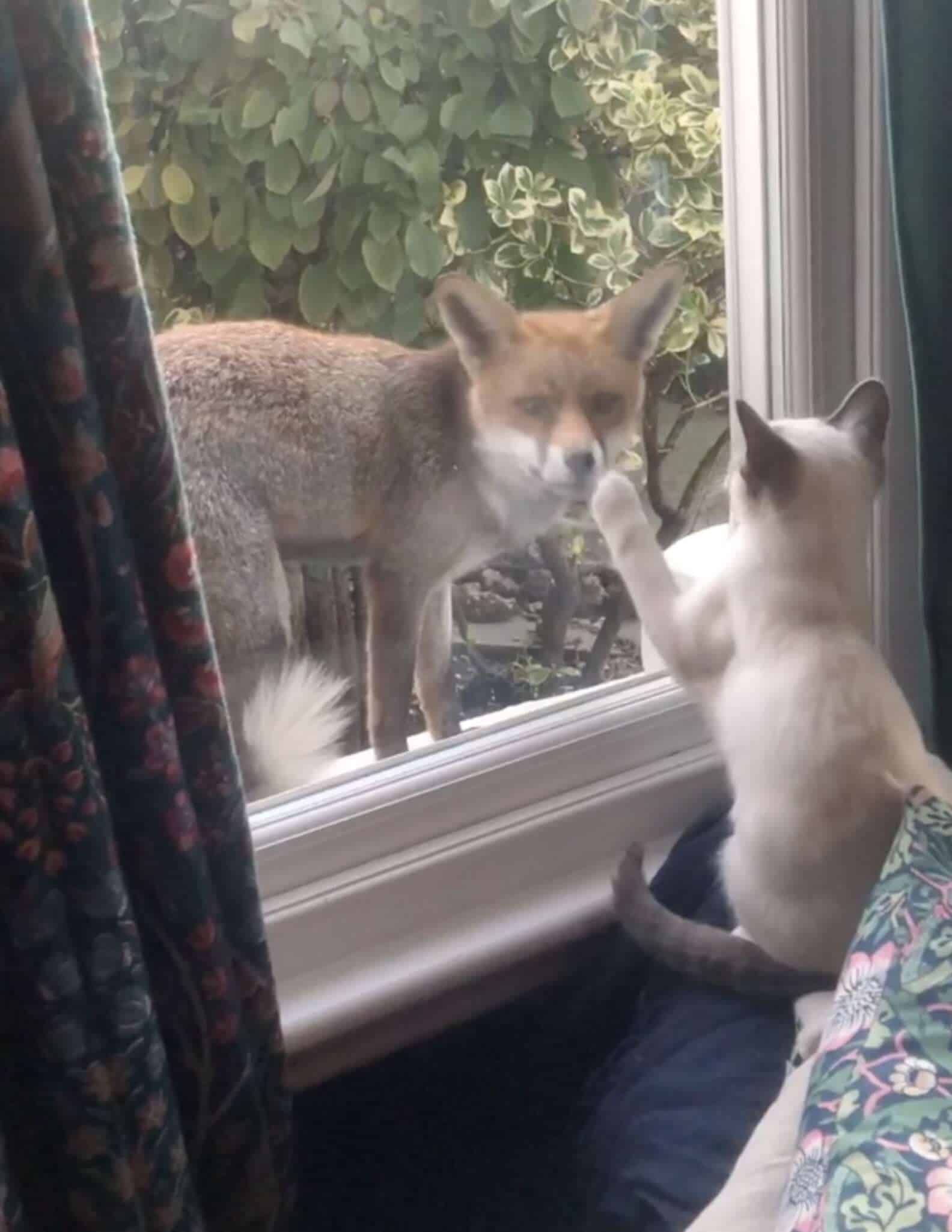 “Dodo estava no meu joelho e eu apontei a raposa para ela”, disse Rutter. “Ela pulou na janela e chamou a atenção da raposa, e então comecei a filmar. Nunca os vi interagir antes, e foi tão comovente vê-los se espelhando. ”