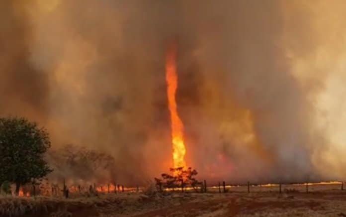 Um imenso “redemoinho de fogo” se formou durante uma queimada na plantação de cana de uma fazenda situada no município de Santa Helena de Goiás (GO). Já é o segundo registro do fenômeno na cidade em apenas dois dias.