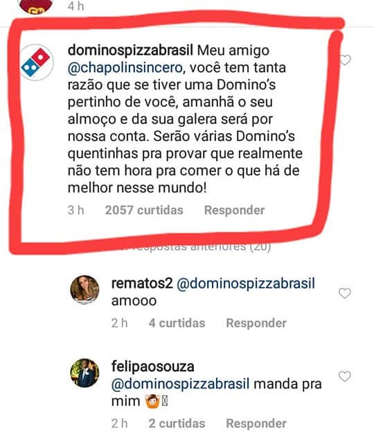 O perfil do @chapolinsincero fez um post zuando o fato de pizzarias só abrirem à noite. A Domino’s Pizza respondeu ao post e a repercussão do caso está contado em fotos p vcs!