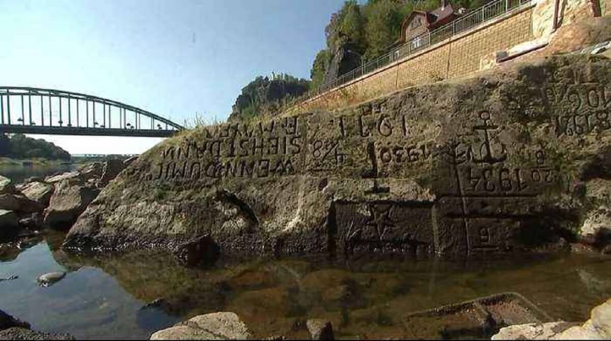 As pedras estão no rio Elbo e pela tradição, deveriam permanecer abaixo do nível rio, entretanto, com o recorde de seca que assola a região, as rochas com as palavras grifadas vieram a tona mais uma vez.