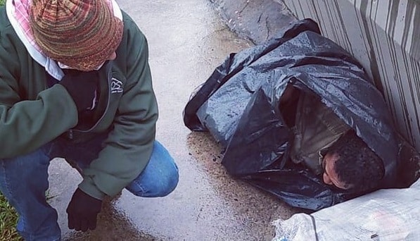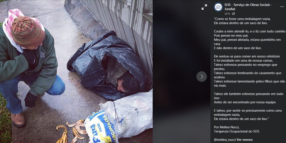 “Ele estava molhado e muito debilitado. Ele tem uma família, tem filhos. Eu escrevi o texto porque fiquei olhando para ele e pensei que podia ser meu pai. Esses filhos não devem nem imaginar que o pai deles foi encontrado assim. A família mora em Osasco e ele não sabia que não estava lá, estava muito confuso. Eu fico sem conseguir definir se ele estava nessa situação pelo frio e fome, então falei para ele ficar quentinho e ficar na casa de passagem no fim de semana”, explica.