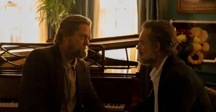 A caracterização de Offerman como Bill é bem semelhante à versão do jogo, com penteado, barba… e sempre armado.