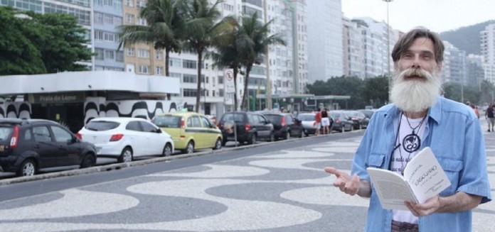 O ator ganha dinheiro recitando poesias, vendendo livros e dando aulas de interpretação ao ar livre, em um quiosque da praia do Leme, na capital fluminense.
