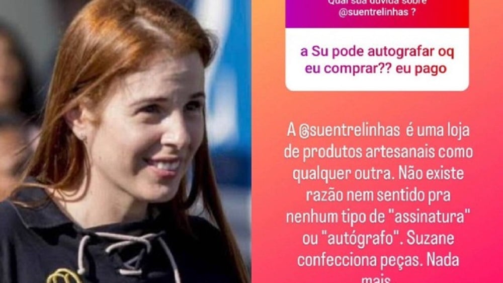 Outra seguidora foi além. Afirmou que pagaria por um autógrafo dela. “A ‘Su Entre Linhas’ é uma loja de produtos artesanais como qualquer outra. Não existe razão nem sentido para nenhum tipo de ‘assinatura’ ou ‘autógrafo’. Suzane confecciona peças. Nada mais”, respondeu a administradora da página.