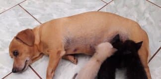 Essa cadela de 7 anos nunca teve filhotes e resolve adotar 3 gatinhos abandonados