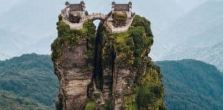 Os dois belos templos budistas suspensos nas nuvens, nos portões do céu