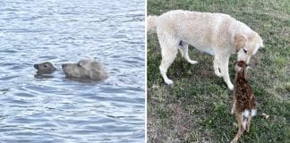 Cachorrinho nada 60 metros em lago para salvar filhote de cervo que estava se afogando