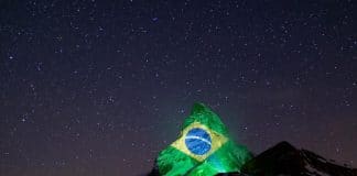 Na Suíça, bandeira brasileira é projetada em montanha com desejos de força aos brasileiros contra o coronavírus