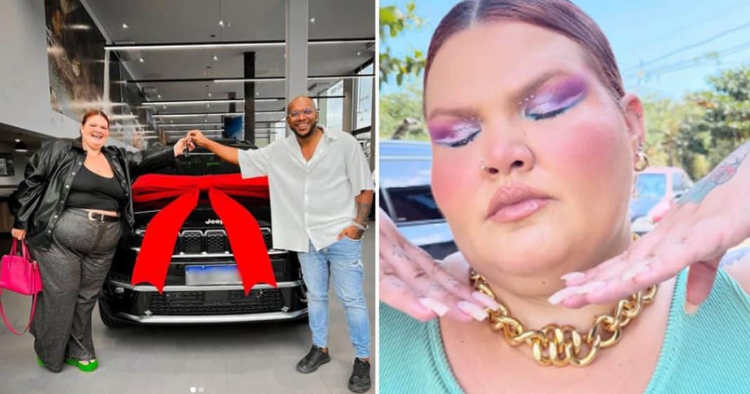 Thais Carla compartilhou com o seu público uma foto com carro novo e afirmou: “Mulher gorda pode e deve realizar seus sonhos”.
