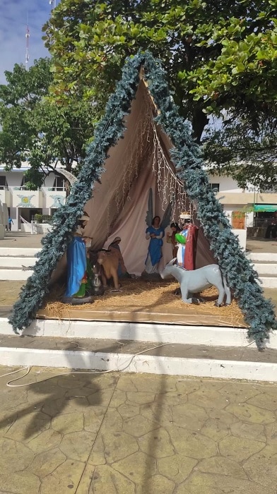 Em Palenque, no México, um pitoresco presépio foi exposto dentro de uma pequena tenda na praça principal da cidade. Ele apresenta a típica variedade de estatuetas de férias colocadas em silêncio pacífico.